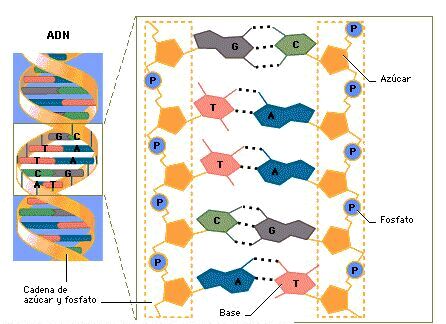 La molécula de ADN tiene la estructura de una escalera formada por azúcares, fosfatos y cuatro